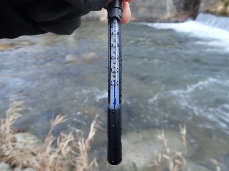 水温計を取り出して川の水温を測ってみると、表示は「4度」。